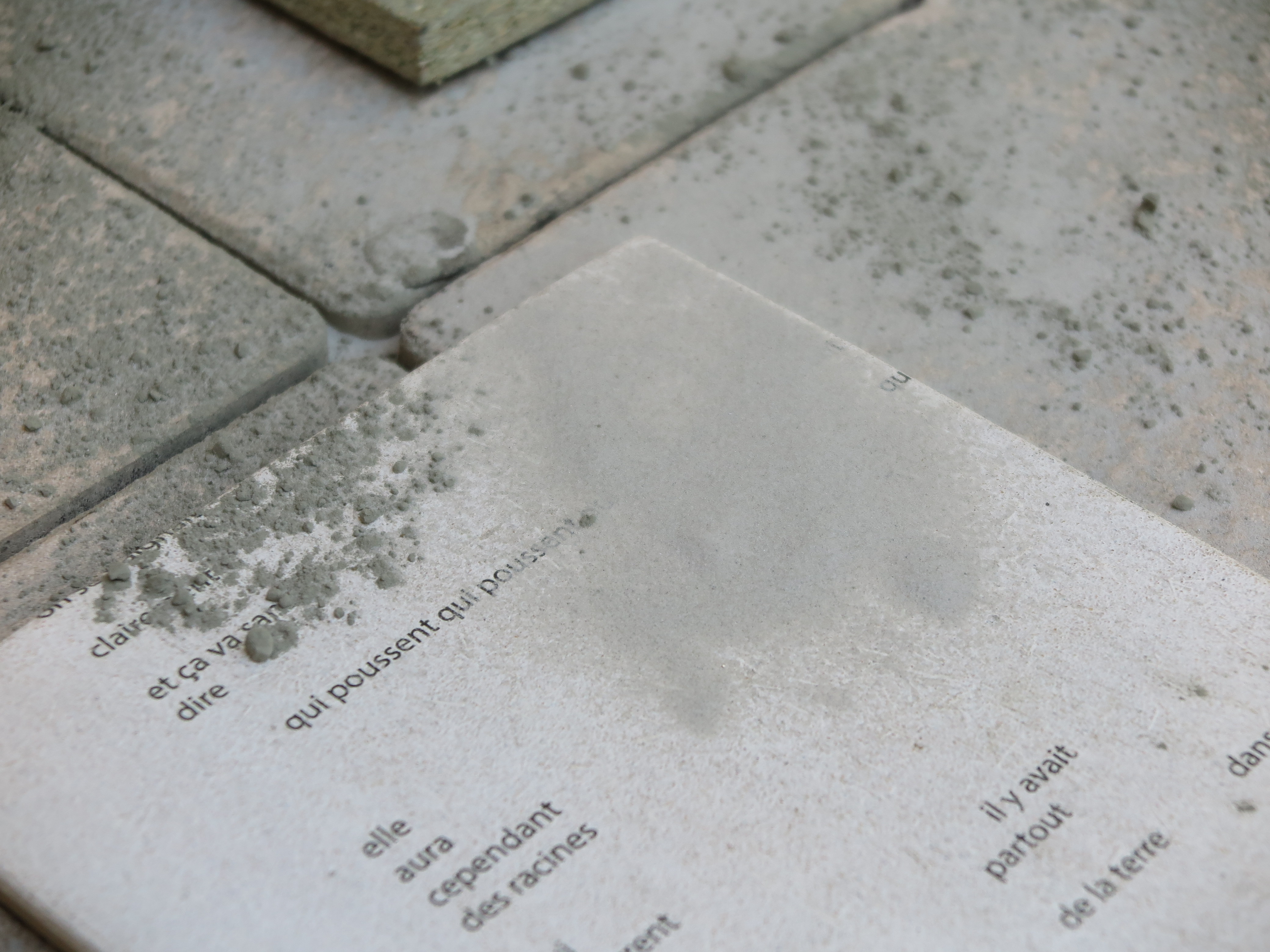 Ciment, terre, sable, acrylique plastique, mots, impression UV, dimensions variables